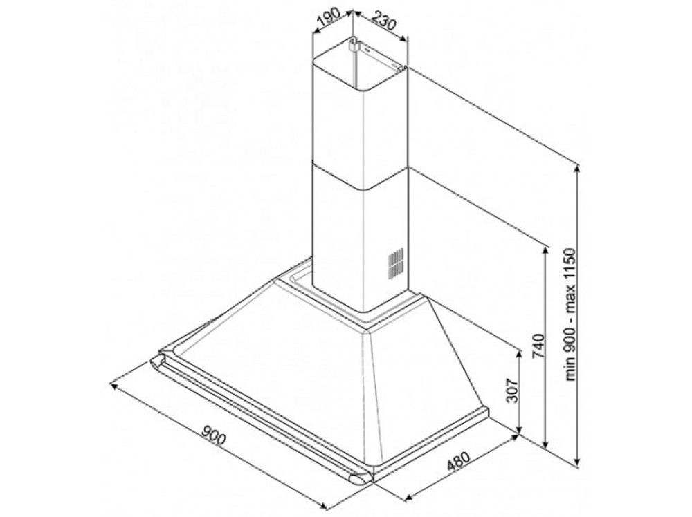 Купольная вытяжка отличается высокой производительностью и внушительными размерами рабочей зоны. Но благодаря компактному куполу и эргономичному воздуховоду она не выглядит громоздкой. Ширина вытяжного прибора 90, глубина 45 см, производительность – 788 м3/час. Техника предназначена для габаритных плит и кухонь площадью до 20 м2.