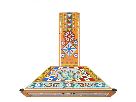 Взрыв ярких красок, полный повествовательного акцента: украшение этого кухонного прибора черпает вдохновение из мотивов традиционной сицилийской тележки, используемой странствующими торговцами цитрусовыми фруктами и десертами изо льда, которую можно найти в самых живописных уголках Сицилии. Формы и цвета воспевают поэтику этого образа, одного из самых узнаваемых фольклорных символов острова. Фронтальная часть украшена геометрическими, полихромными и ромбовидными мотивами, используемыми и в напольной плитке и стилизованными звездочками и цветами, которые отсылают к нежной весенней атмосфере. В центре корпуса вытяжки доминирует характерная для Сицилии опунция, по бокам изображены фрукты, внизу – фриз из растительных и цветочных мотивов. Декоративный орнамент продолжается до самого дымохода, гармонично завершая эту симфонию узоров и роскошных оттенков.